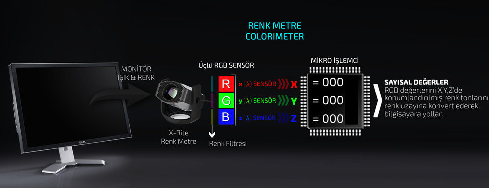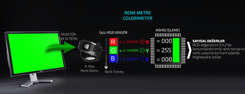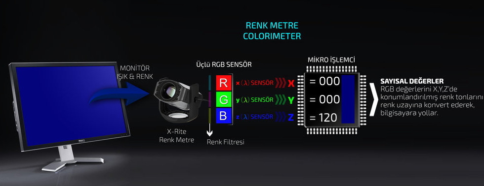 Görüntülemede kullanılan çıkış aygıtlarını renk profili ve kalibrasyon yapmak için kullanılır. Renk Metrelerin sensör kısmı filtrelemiş silikon foto detektörler kullanılır. Görünür spektrumdaki renk tonları ve ışığı okumasını sağlayarak sayısal veriye çevirir ve yazılımlar üzerinden hesaplama yaparak doğru Gamut renklerini bulmamızı sağlar.