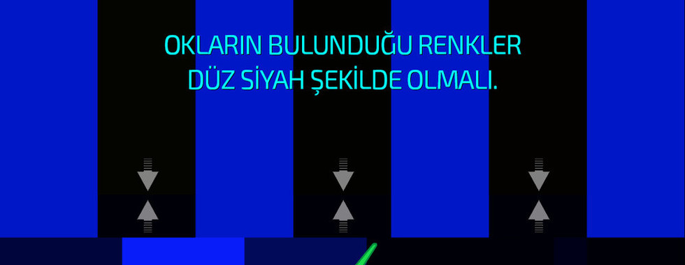 Üst kısımdaki renkler Sarı, Yeşil ve Kırmızı, alt kısımda da siyah olan bölümdeki tonlarla üsteki tonlar düz siyah bir çizgi olacak şekilde olmalıdır. Eğer siyah tonlardan alt kısımdaki gözüküyorsa Kroması (Saturation) yüksektir. Ayarlardan Kroması (Saturation) seviyeni düşürerek, daha uzun çizgi olacak şekilde. Düz çizgi olacak, seviyesine kadar getirelim.